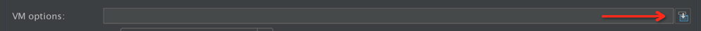 接下来就是很关键的需要引入 JRebel 的地方了, 在 VM options 的最右边有个箭头, 点进去